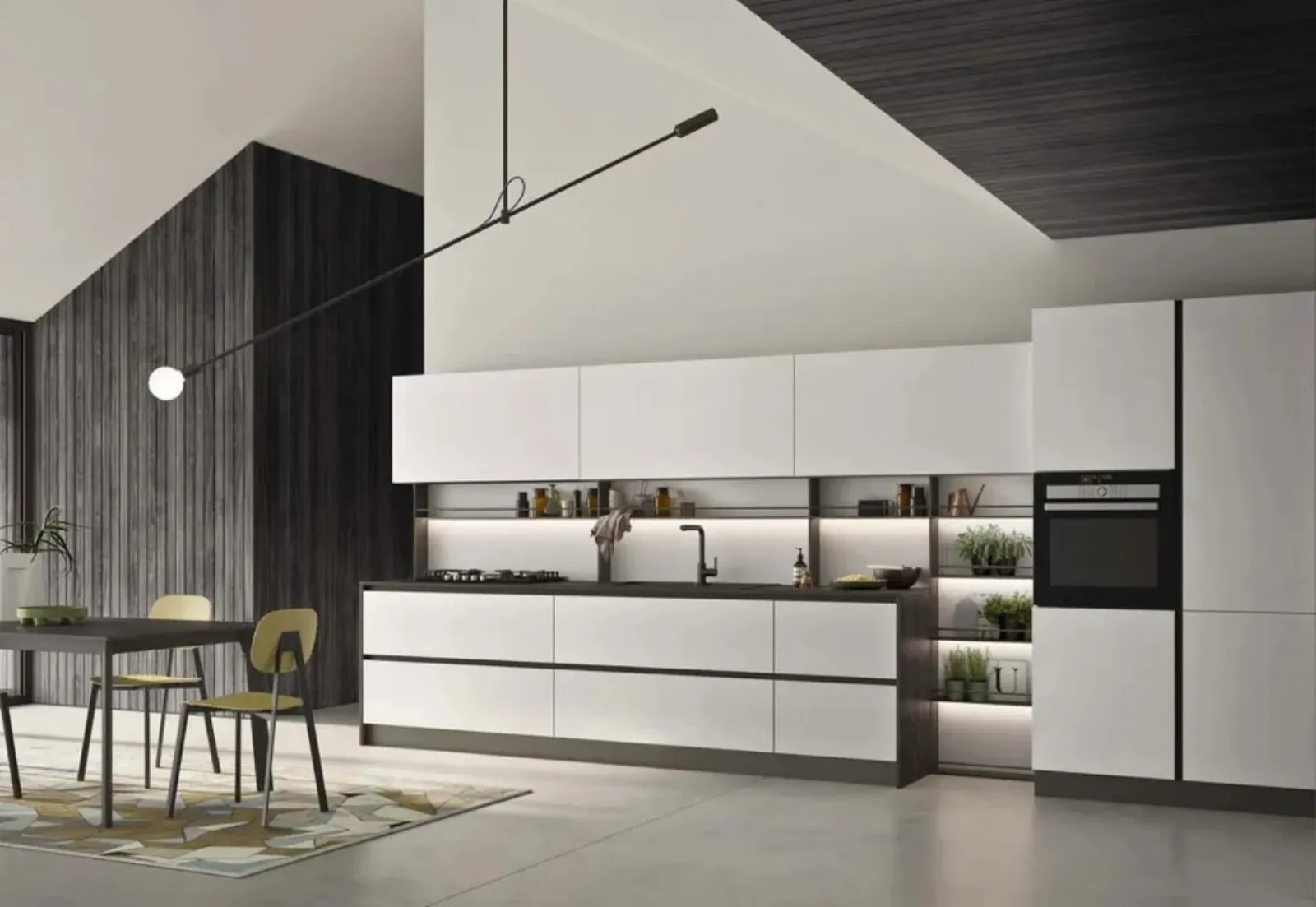 Questa soluzione ti sorprenderà grazie alla scelta quasi infinita di materiali e accessori sempre disponibili visitando il nostro showroom. Con la Cucina Moderna lineare Sky 06 di Ar-Tre potrai organizzare gli spazi impreziosendoli, coniugando in modo ottimale originali doti di praticità e linee ben studiate. Se vuoi una composizione in melaminico, ti consigliamo il modello presente in foto: materiali di prima scelta e finiture di tendenza sono assicurati.
